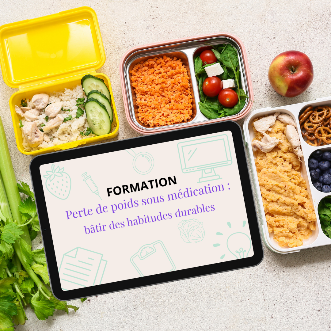 Perte de poids sous médication : bâtir des habitudes durables est une approche nutritionnelle complète, développée par des diététistes-nutritionnistes, spécifiquement pour les personnes utilisant (ou envisageant) une médication de type GLP-1 (Ex. Wegovy, Ozempic, Zepbound, Mounjaro).